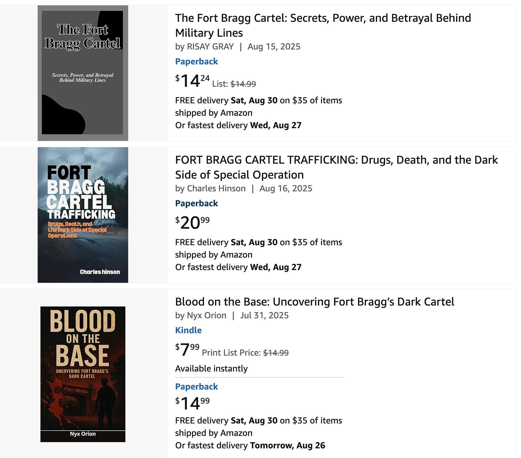 As Seth’s publication day approached, he would sometimes check his Amazon listings. He found that along with The Fort Bragg Cartel, numerous other titles were being listed on Amazon that seemed suspiciously similar.