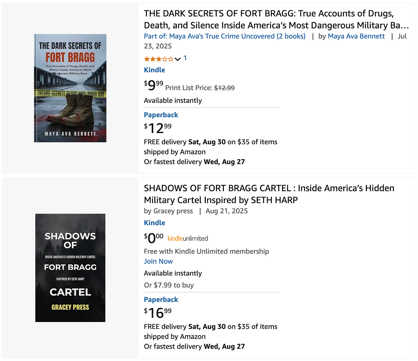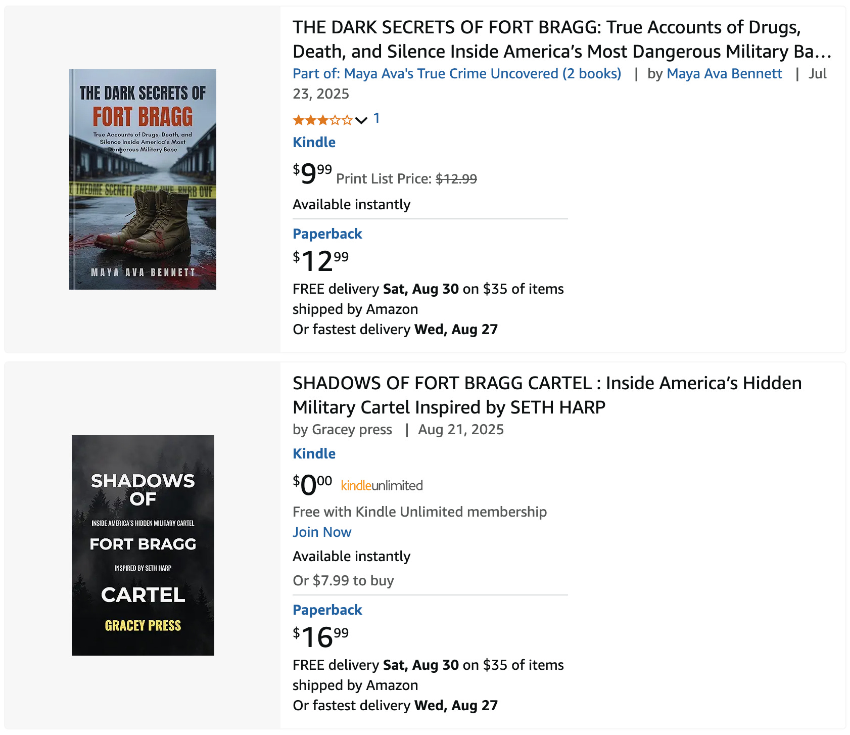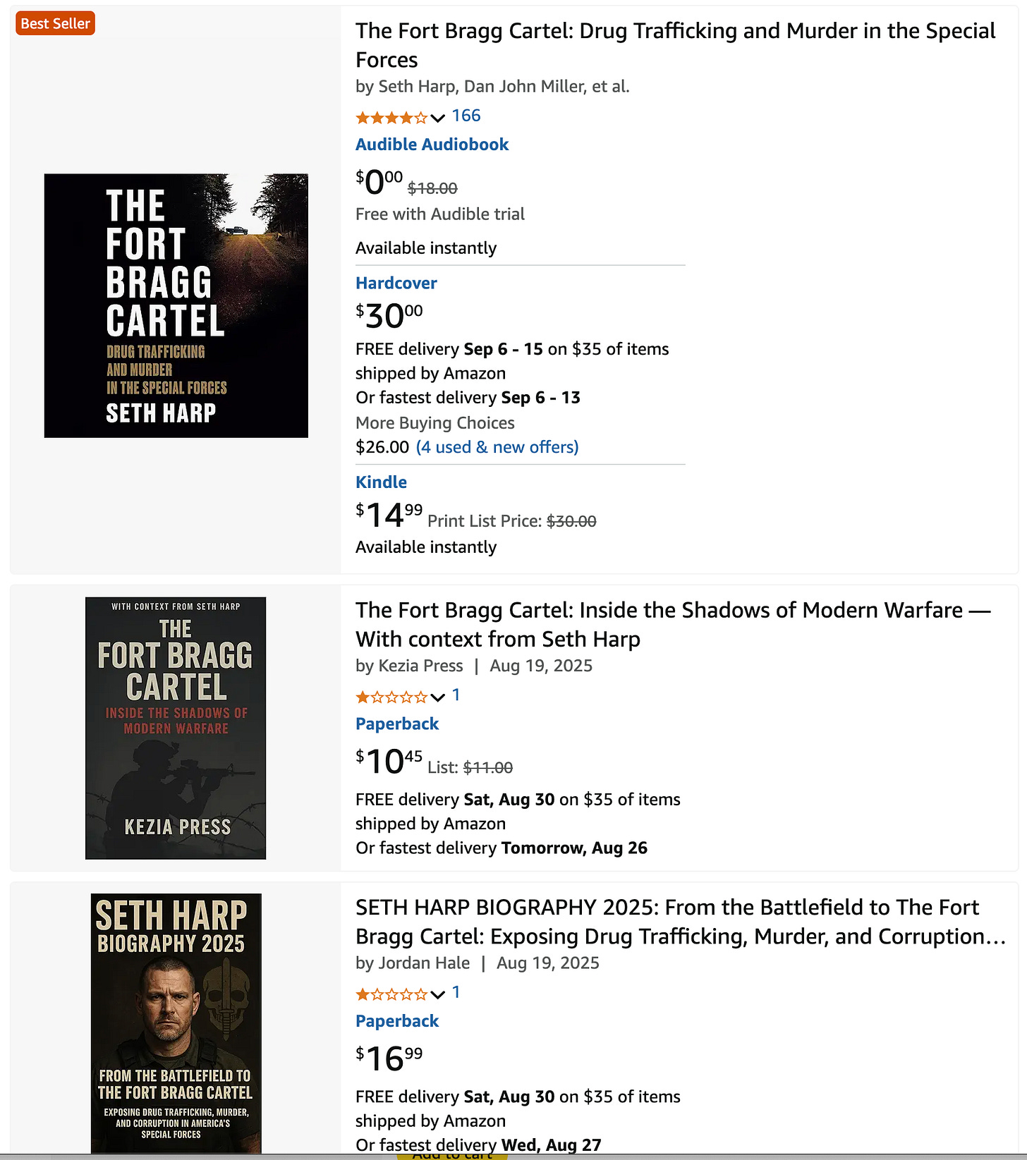 These titles often have keywords in the title or subtitle, e.g., ‘Fort Bragg,’ ‘Cartel,’ ‘Drug Trafficking.’ One of them went so far as to include Seth’s full name in the subtitle: The Fort Bragg Cartel: Inside the Shadows of Modern Warfare — With context from Seth Harp. Others purported to be the ‘real’ story of Fort Bragg, establishing a contrast with Seth’s book, perhaps. Still others claimed to be biographies of Seth.