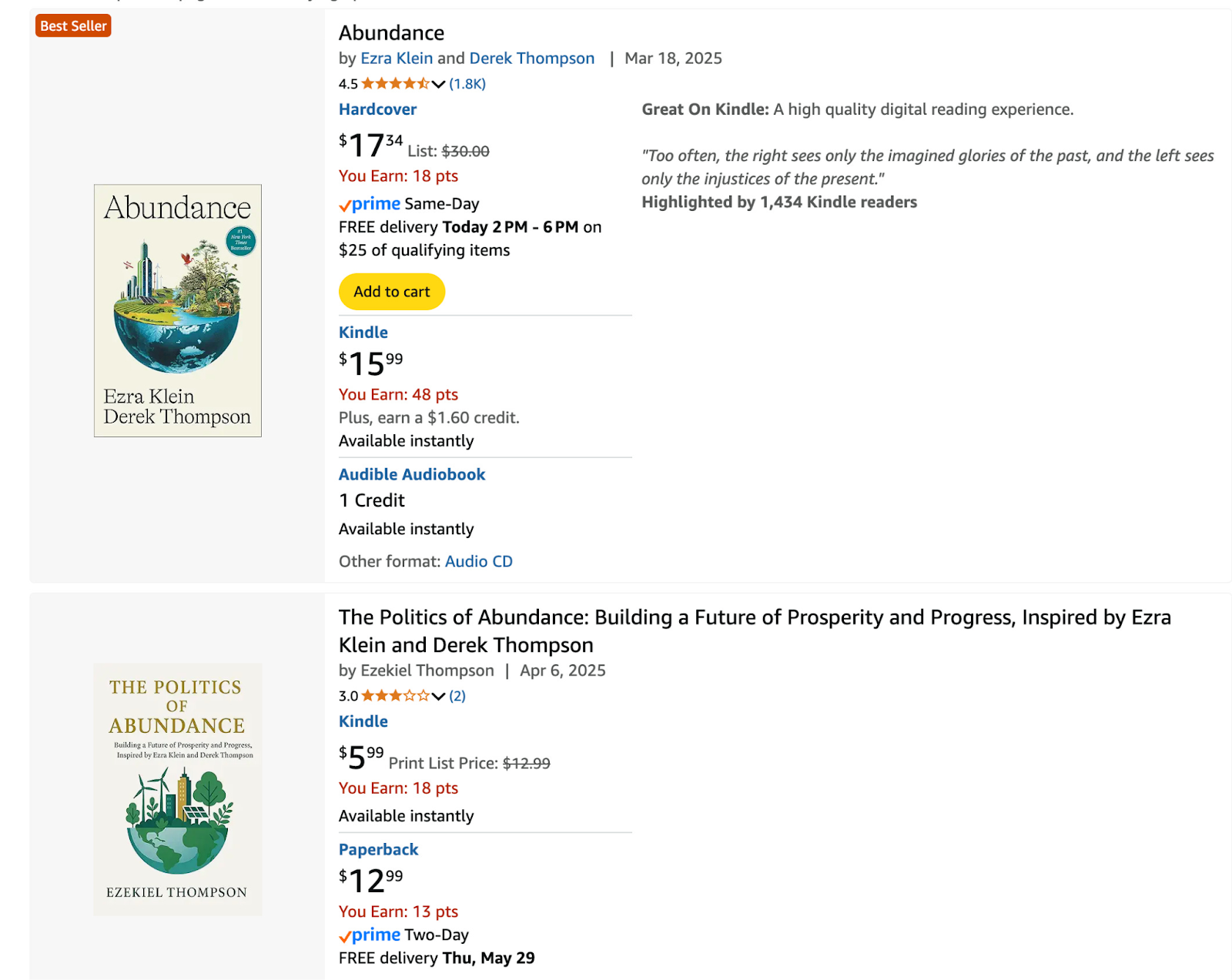 Seth isn’t alone in this, to be clear. Earlier this year, Ezra Klein and Derek Thompson released Abundance, an instant bestseller. Within a few weeks, I found this book on the Amazon listings: The Politics of Abundance: Building a Future of Prosperity and Progress, Inspired by Ezra Klein and Derek Thompson. It is attributed to an author by the name of Ezekiel Thompson, some sort of unholy variation on ‘Ezra Klein’ and ‘Derek Thompson.’